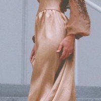 Mocha Silk Charmeuse, matching Silk Chiffon Tambour beaded with bronze bugle beads and topaz crystal lochrosens, corseted waist